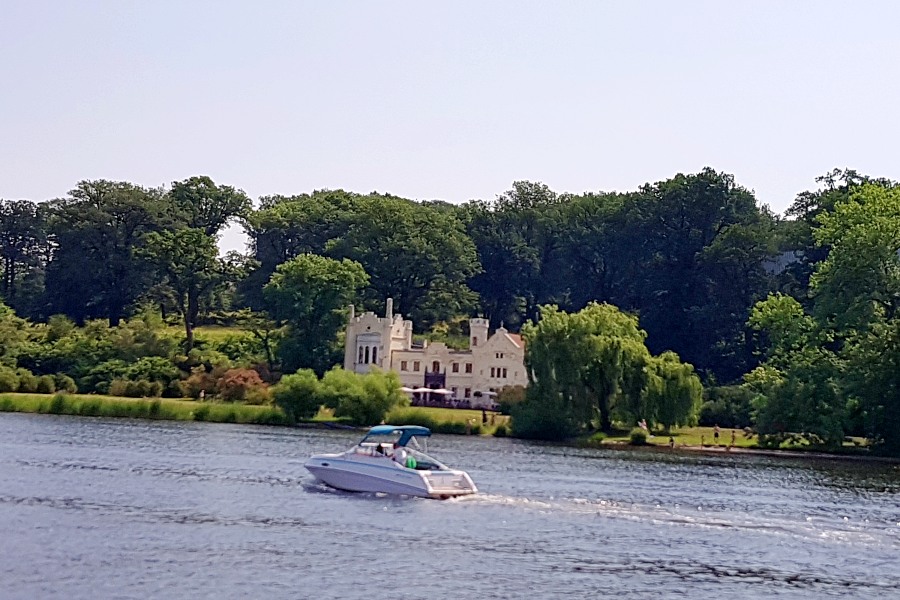 Blickfang der Pfaueninsel ist das kleine weiße Schloss an seinem Ufer, das aus sentimentalen oder romantischen Gründen schon als Neubau wie eine Ruine wirken sollte – jedoch allen Ansprüchen seiner königlichen Nutzer genügen musste. Über die Pfaueninsel gäbe es noch viel zu erzählen, doch wir müssen uns damit begnügen, kurz die imposante Kulisse zu genießen. Das Schiff dreht und nimmt Kurs auf den Jungfernsee.