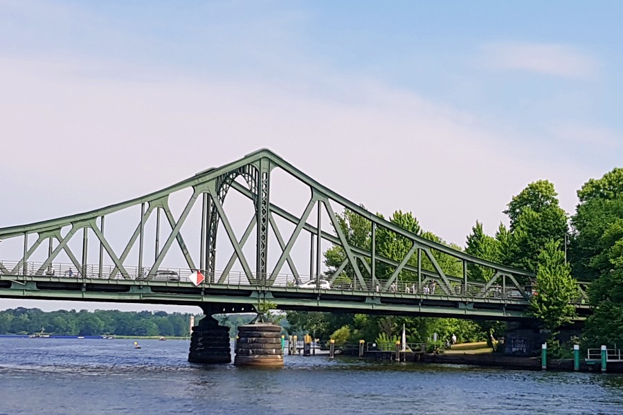 Fahren wir also weiter durch die Humboldtbrücke und stellen uns vor, wie auf der rechten Seite der Park Babelsberg vorbeizieht – der Flatowturm, die Gerichtslaube, das Matrosenhaus, die Fontäne, das Schloss – alles eingebettet in üppiges Grün. Dann wenden sich alle Blicke der Glienicker Brücke zu, dem Schauplatz der berühmten Agentenaustausche und Symbol der deutschen Teilung. Die Mitte der Glienicker Brücke markierte einst die streng bewachte Grenze nach Westberlin.