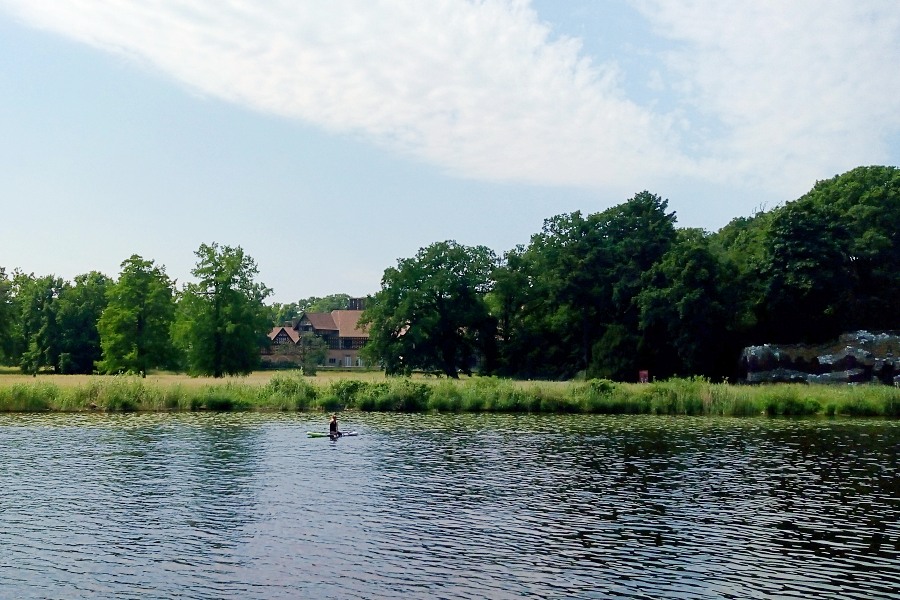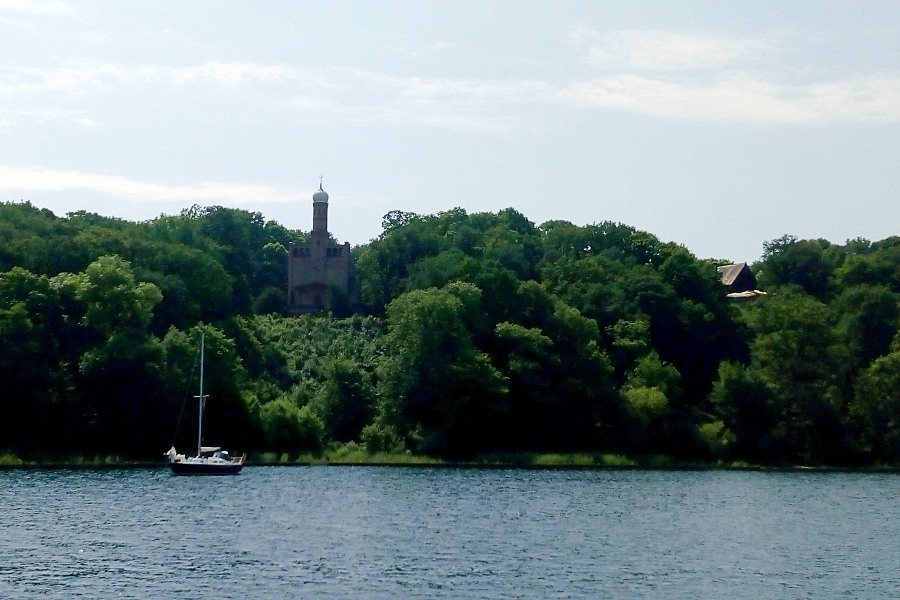 Wir orientieren uns weiter nach rechts und fahren vorbei am Schlossgarten Glienicke. Diese Uferseite gehört bereits zu Berlin war zu Zeiten der Mauer für Potsdamer unerreichbar. Das Schloss Glienicke bleibt hinter Bäumen verborgen, umso stolzer präsentiert sich das Casino Glienicke, im Stil einer italienischen Villa errichtet und in strahlendem Weiß. Hinter dem Gasthaus Moorlake in einer kleinen Havelbucht bäumt sich die Uferböschung zu ansehnlichen Hügeln auf. In den Hang gebaut ist das russische Blockhaus Nikolskoe zu sehen, das von der familiären Verbindung der Hohenzollern zum Zarenhof zeugt. Daneben steht die Kirche St. Peter und Paul, gleichsam abgelegen mitten im Wald – entstanden auf Wunsch einer preußischen Prinzessin, die später einmal Zarin wurde und dort ein Glockenspiel wollte, das über die Havel bis zur Pfaueninsel klingt.