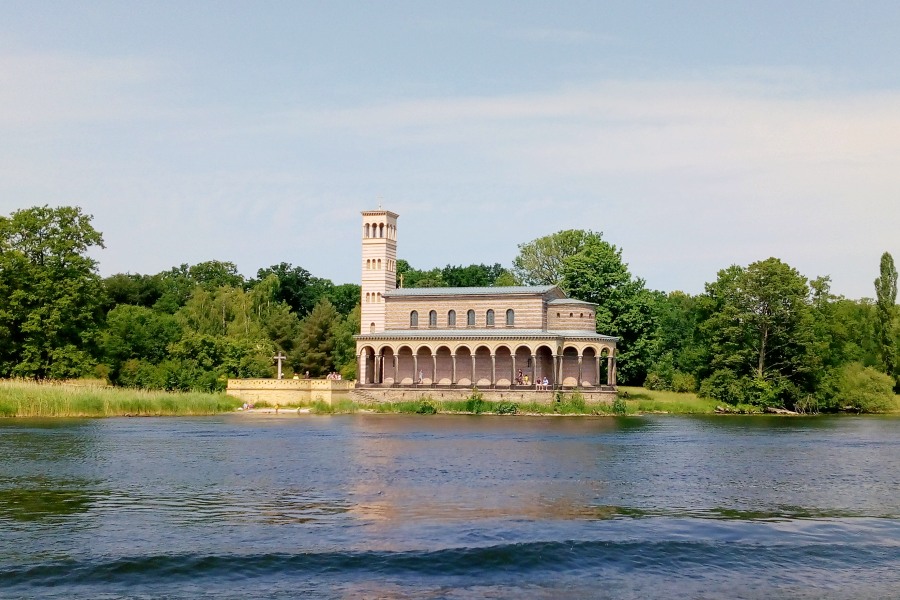 Wie ein festgemachtes Schiff steht die Sacrower Heilandskirche mit ihren schönen Arkadengängen direkt am Fluss. Wieder ein sehr italienisches Ensemble. Der freistehende Glockenturm – den man natürlich Campanile nennen muss – war fast 29 Jahre lang Bestandteil der Berliner Mauer und die Kirche selbst lag unerreichbar im Niemandsland. Mit der Restaurierung nach der Wende sind die Spuren der Verwahrlosung endlich verschwunden. Auch der Neue Garten, dem wir nun nahekommen, endete lange nicht am Ufer, sondern an einem Grenzzaun.