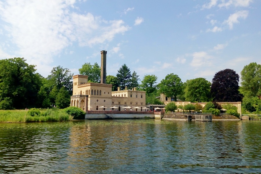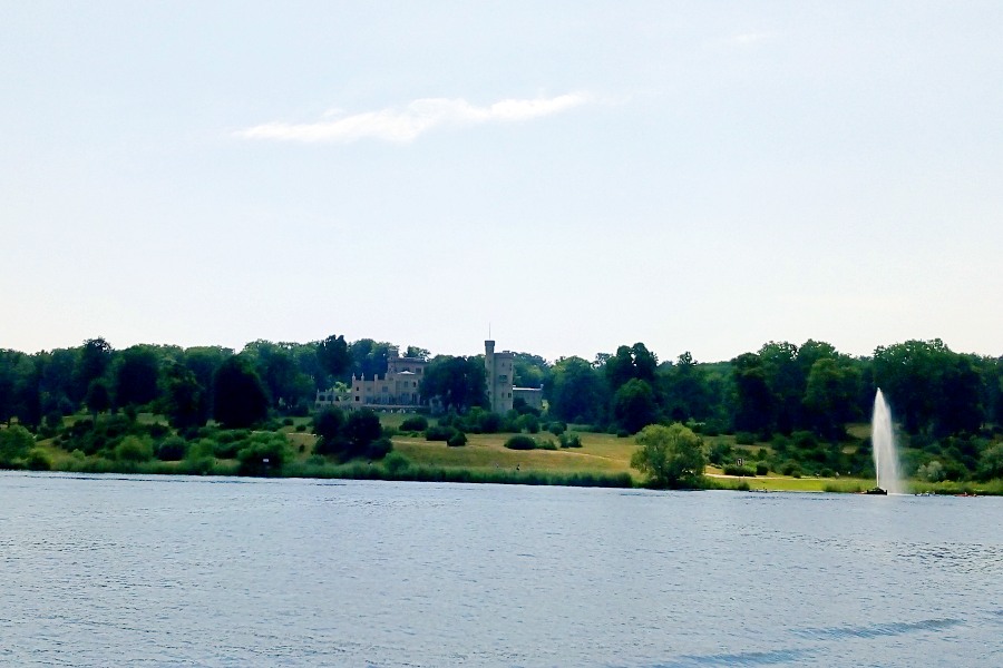 Hinter der Glienicker Brücke steuern wir auf das Schloss Babelsberg zu – eine Mischung aus englischer Gotik und mittelalterlicher Burgenromantik. Das Schloss, an dem Schinkel, Persius und Prinzessin Augusta ihre Spuren hinterlassen haben, und der Park, der von Lenné geplant und von Fürst Pückler vollendet wurde, sind unbedingt einen eigenen Besuch wert. Der Wunsch, alles noch einmal aus der Nähe zu sehen, ist spätestens erwacht, wenn man die Havelfontäne passiert.