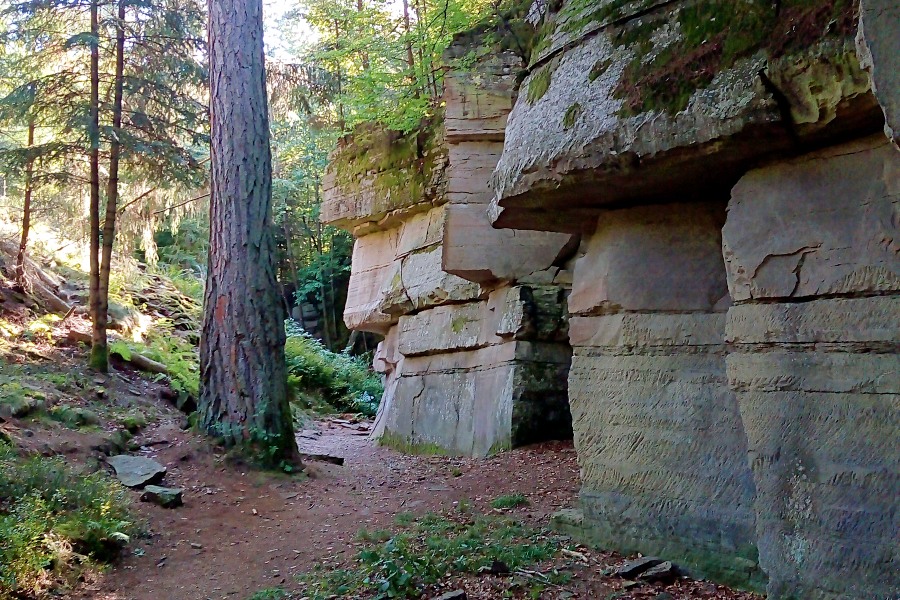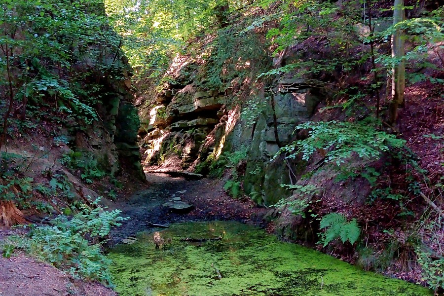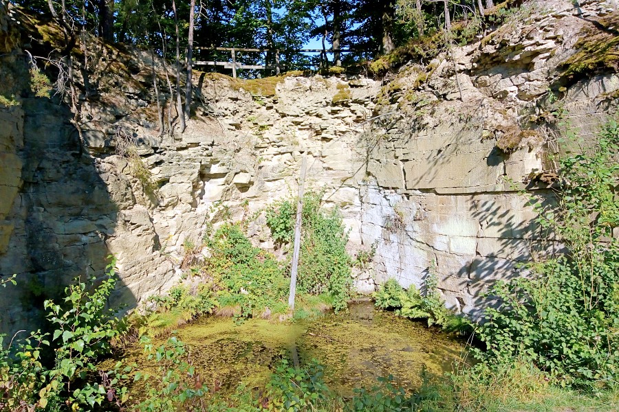 Neben dem holperigen Weg haben sich in Senken entlang der Abbruchkante kleine Tümpel gebildet. Von den Kröten, die auf einer Infotafel erwähnt werden, ist aber weder etwas zu sehen noch zu hören. Dafür ist es vermutlich die falsche Jahreszeit. Tiefer im Steinbruch rücken die Felswände enger zusammen und bilden einen schattigen Hohlweg. Hier geht es im wörtlichen Sinne über Stock und Stein, und Spaziergänger mit Kinderwagen oder Gehhilfen haben ihre liebe Not. Für sie ist der mit Wurzeln und Felsen gespickte Weg wenig geeignet; als Kulisse für einen Abenteuerfilm wäre er jedoch perfekt.