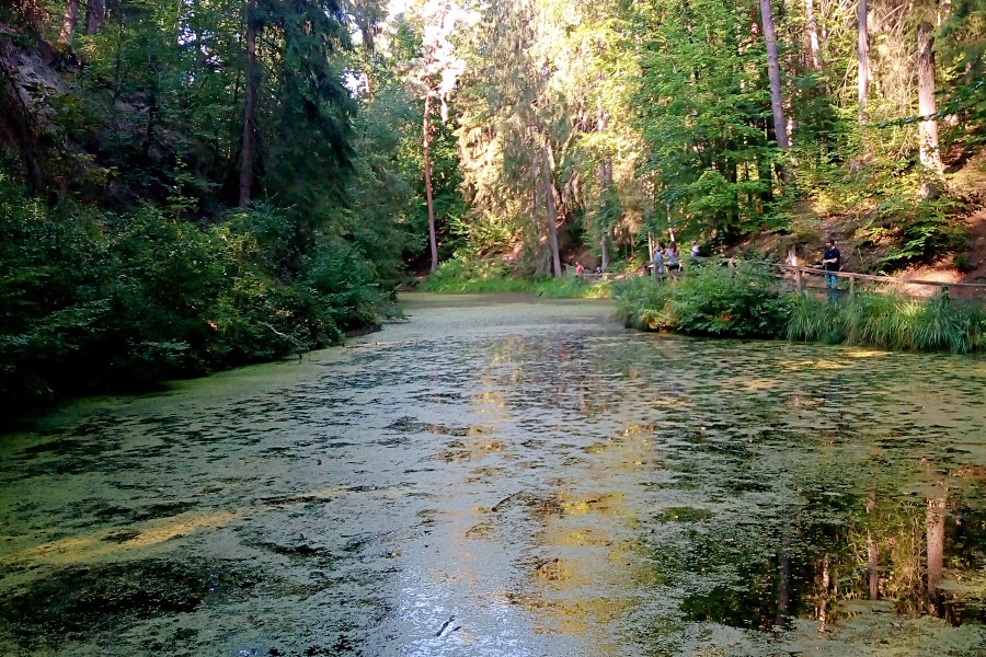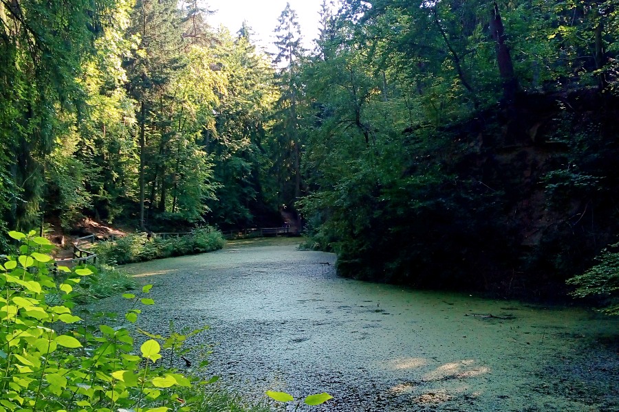 Der Märchensee trägt seinen Namen zu Recht: Der Weg zwischen den Felsen öffnet sich zu einem Talkessel, und die Wipfel der Bäume rauschen über einem grünen Teppich aus Wasserlinsen, auf dem Lichtflecken tanzen. Was für ein magischer Anblick! Völlig klar, nur ein mächtiger Zauber kann so etwas in einer Nacht geschaffen und mit unerklärlichen Kräften das Wasser aus der Tiefe des Berges emporgehoben haben.