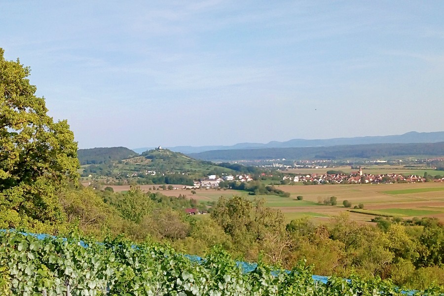 Ein schmaler Pfad führt am Märchensee vorbei und wieder aus der Schlucht heraus. Nur wenige Schritte später winkt blauer Himmel zwischen den Baumstämmen und der Waldrand ist erreicht. Wir sind am südlichen Hang des Pfaffenbergs und er erweist sich als Aussichtspunkt mit famoser Fernsicht. Über die Weinberge hinweg geht der Blick weit ins Neckartal bis hinüber zu den Höhen der Schwäbischen Alb; hinter Wendelsheim ist Rottenburg zu sehen, rechterhand das Dorf Wurmlingen, und nach einem Schritt vom Waldrand weg rückt sogar die weiß-rot leuchtende Wurmlinger Kapelle auf ihrem Berggipfel ins Bild.
