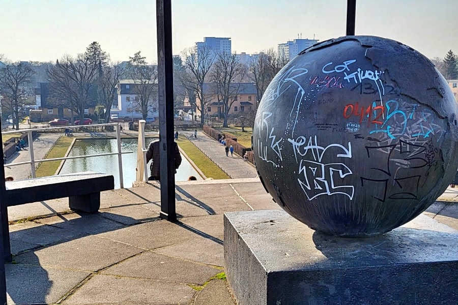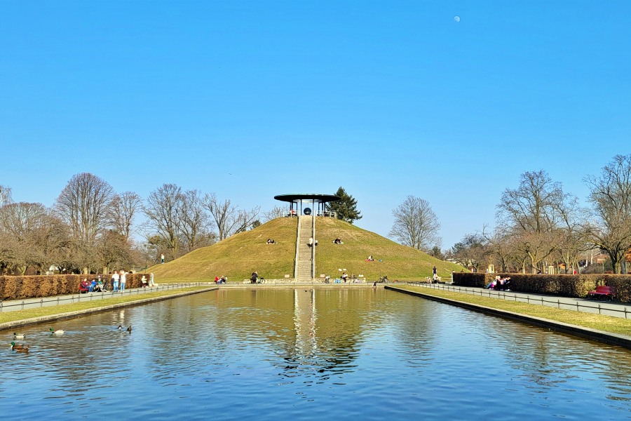 Vor dem Berg wurde ein rechteckiges Bassin angelegt, das vermutlich die Flugstrecke der Gleiter markiert. Die seitlich gelegene ehemalige Tongrube wurde zum Karpfenteich. Ab 1928 entstand auf dem Hügel das Säulenrondell mit einer bronzenen Weltkugel in der Mitte. Die Weltkugel teilte im Zweiten Weltkrieg das Schicksal vieler Kirchenglocken und wurde eingeschmolzen. Danach verwilderte der Park, eine spätere Sanierung brachte eine Steinkugel als Platzhalter, bis endlich 1990 wieder ein bronzener Globus das Ensemble komplettierte.