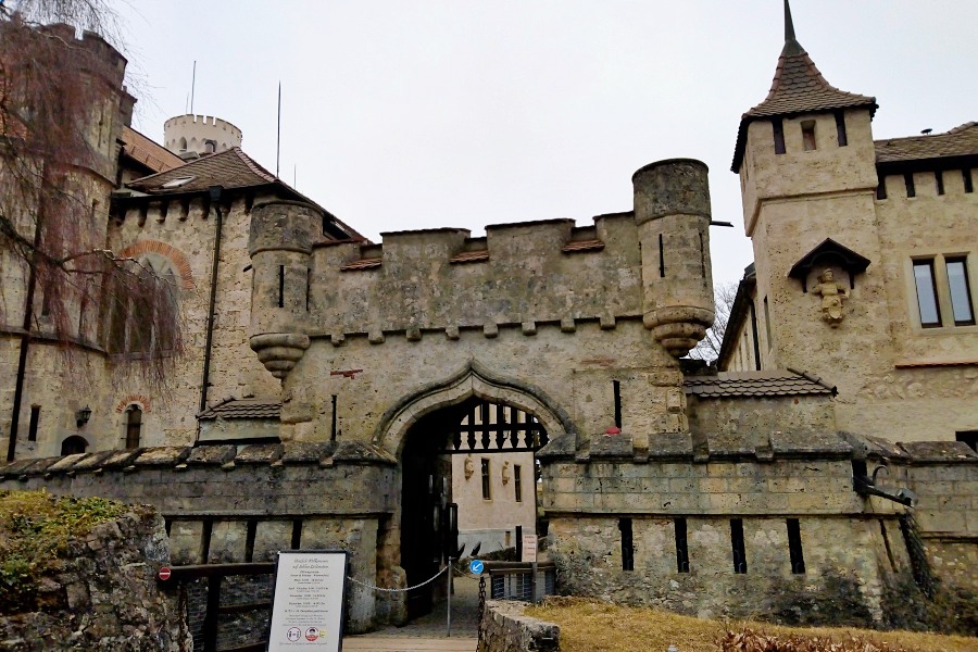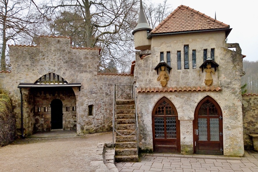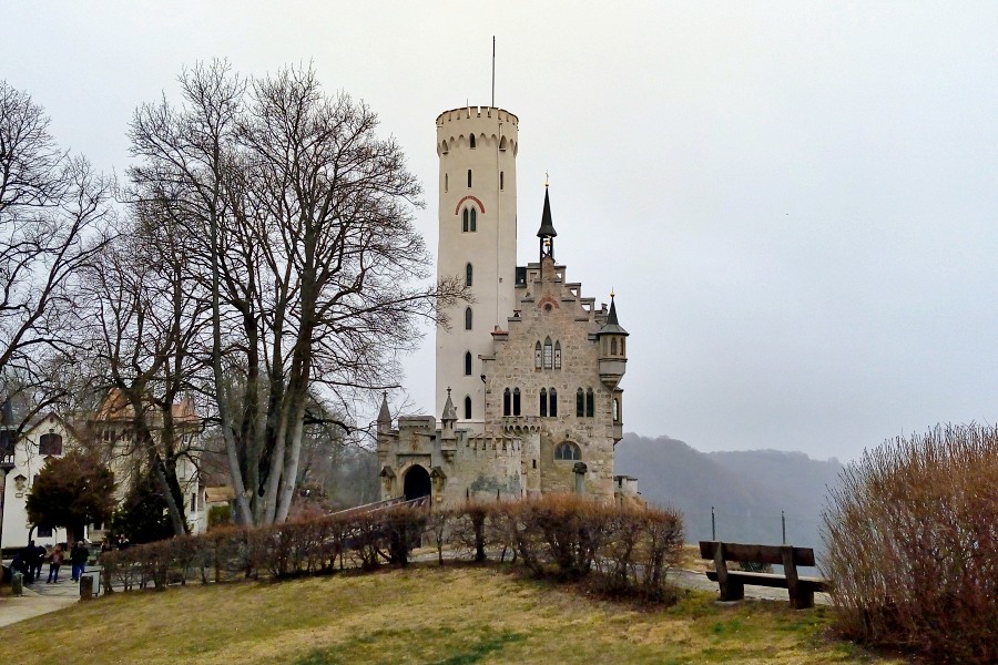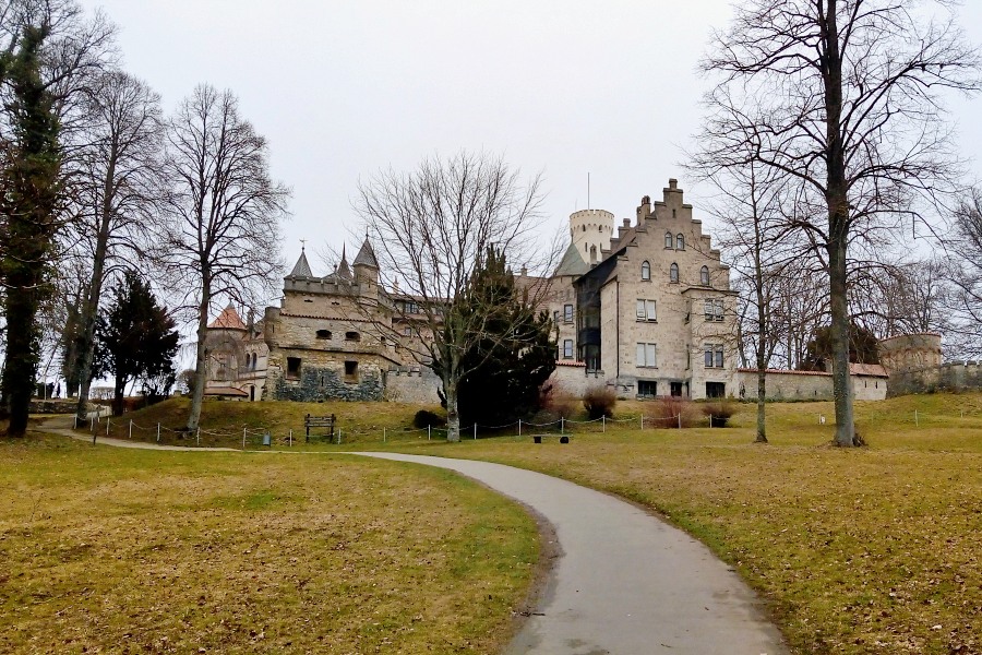 Wir waren bereits vor mehr als zehn Jahren beim Schloss Lichtenstein. Damals war Herbst, diesmal naht der Frühling, doch das Wetter ist ähnlich feucht und kühl. Damals hatten wir uns die Innenräume des Schlosses angeschaut, diesmal verzichten wir auf eine Führung, denn die Corona-Auflagen verlangen nach Impfzertifikat, aktuellem Schnelltest und Maske. Alles Mühsal, die doch nicht verhindern kann, dass eine Menschentraube sich durch die Flure drängt und die Forderung Abstand zu halten sich als leere Floskel erweist. Der Verzicht fällt uns leicht, wir erinnern uns noch gut an das blaue Sternengewölbe der Schlosskapelle, die deftigen Wandsprüche in der Trinkhalle und das Bild des treffsicheren Schützen im Treppenhaus. Abgesehen davon geben sich auf dem Schlossgelände die reizvollen Aus- und Anblicke unablässig die Hand.