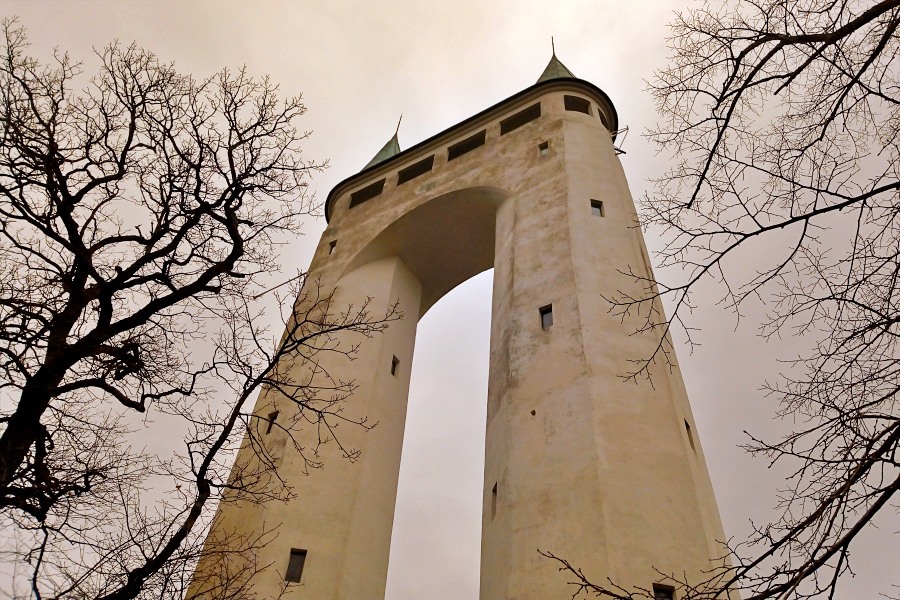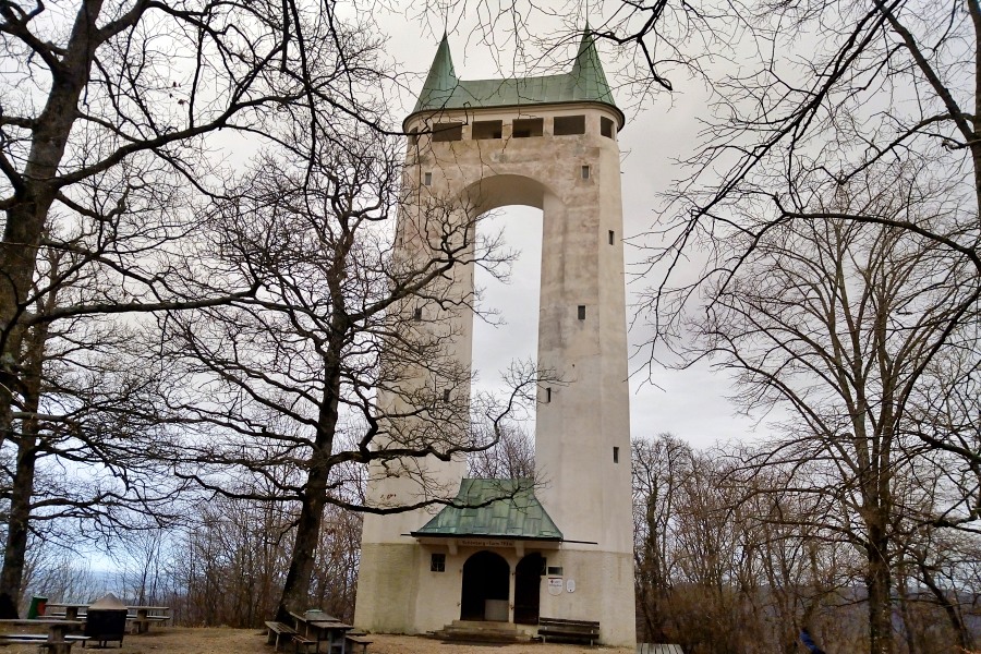 Einer der Doppeltürme dient als Aufstieg, auf der anderen Seite geht es dann wieder hinab. Durch diese Aufteilung ist Gedränge kein Thema und selbst in Zeiten des Corona-Lockdowns war es nicht nötig, den Zugang zum Turm zu verwehren. Oben sind die beiden schlanken Treppenhäuser durch die Aussichtsplattform miteinander verbunden. Die originelle Bauweise und der weiße Anstrich haben dem Turm bei den Einheimischen den Spitznamen „Pfullinger Unterhose“ eingebracht. Die Ähnlichkeiten sind nicht zu leugnen. Natürlich lässt sich auch ein Tor oder ein Triumphbogen erkennen, woran die Erbauer bei der Formgebung vermutlich eher gedacht haben. Ein Aussichtsturm als Tor zur Schwäbischen Alb, direkt an den Albtrauf gebaut. Damals, als 1905 mit dem Bau auf dem Schönberg begonnen wurde, war er der weltweit erste Turm in Stahlbetonbauweise, also eine innovative Angelegenheit. Eine Tafel am Turm kündet stolz davon und nennt den Architekten: Theodor Fischer.