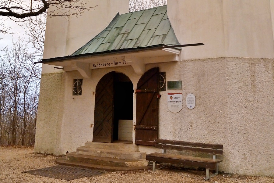 Der Parkplatz nennt sich „Wanne“. Er ist das Ende der Straße und der Ausgangspunkt mehrerer Wanderwege. Er liegt ein gutes Stück unterhalb des Gipfels, der Schönbergturm hinter dem Wald ist nicht zu sehen. Von hier aus geht es nur zu Fuß weiter. Ein Schild weist die Richtung und verspricht uns, nach 500 Metern am Ziel zu sein. Diese Meter jedoch haben es in sich. Es geht wacker bergan, der Steig ist schmal, das feuchte Laub glitschig. Der Trip wird zu einer richtigen kleinen Bergwanderung. Während wir stapfen und kraxeln, erscheint auch der Turm zwischen den Zweigen und keuchend kommen wir oben an.