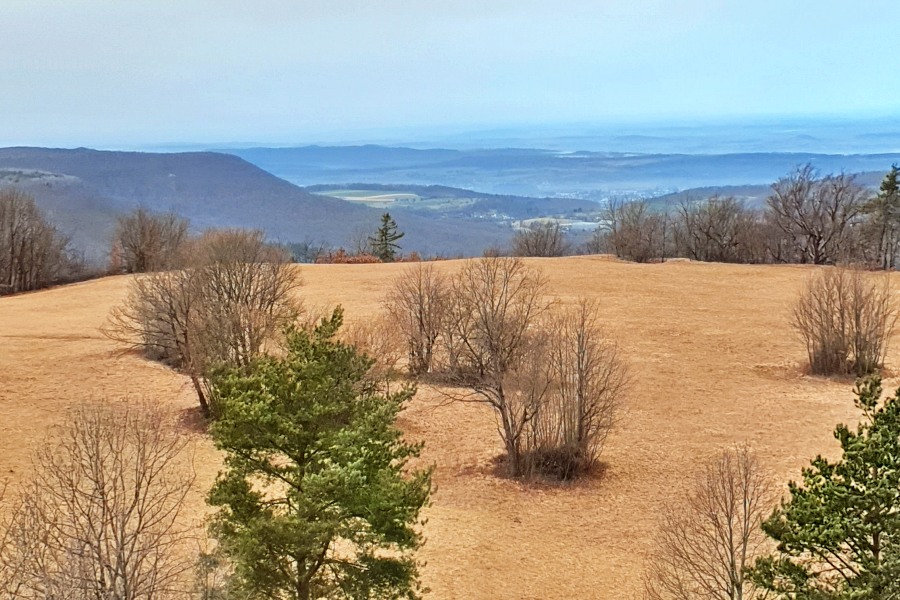 Oben auf der Plattform – man kann sie auch Galerie, Kanzel oder Ausguck nennen – weht uns ordentlich der Wind um die Nase. Die Mühen des Aufstiegs werden mit einem grandiosen Ausblick belohnt. Pfullingen und Reutlingen liegen uns zu Füßen, dahinter breitet sich das Albvorland aus. Links und rechts daneben sind die Bergkuppen des Albtraufs aufgereiht. Orientierungstafeln über den Fenstern helfen dabei, die Berge und fernen Orte mit Namen zu versehen. Auf der anderen Seite das Hochland. Täler, Wälder, Hänge – und selbst Schloss Lichtenstein winkt herüber.