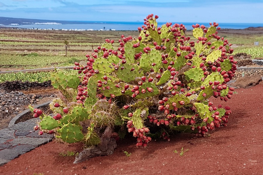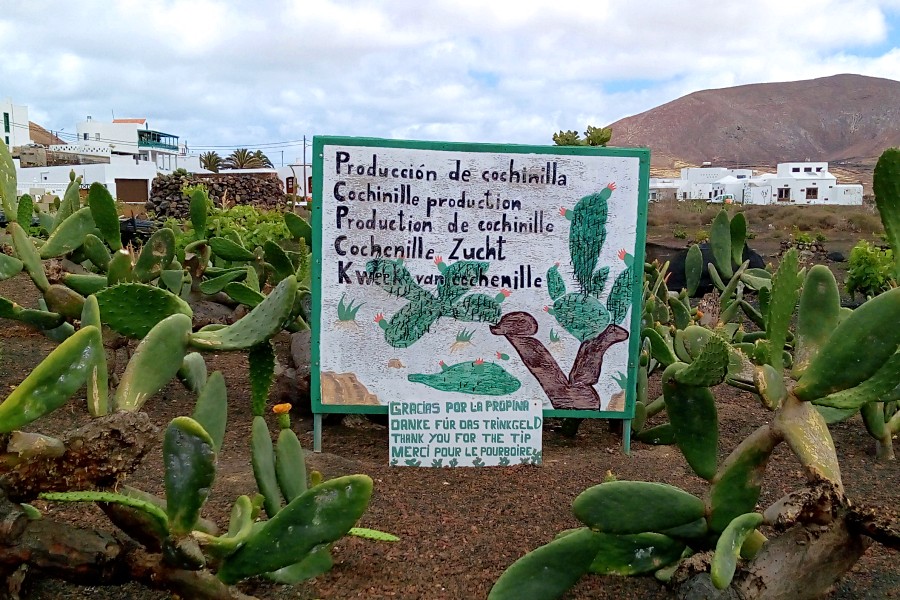 Der Feigenkaktus – botanisch: Opuntia – gehört eigentlich nach Mittelamerika. Er kam im 19. Jahrhundert auf die Kanaren und wird nicht der Schönheit seiner Blüten oder der Süße seiner Früchte wegen hier gehegt, sondern weil er die bevorzugte Wirtspflanze der Cochenille ist. Cochenillen sind hellgrau schimmernde Schildläuse, aus denen sich ein roter Farbstoff gewinnen lässt, der bei anderen für Schönheit sorgt. Die Läuse tragen Karmin in sich, ein purpurfarbenes Sekret, das früher als begehrter Naturfarbstoff für Lippenstifte oder im Campari genutzt wurde. Die Ernte der Cochenillen verläuft recht rabiat: Die Larven der Laus, die wie graue Schimmelklumpen an den Kaktustrieben kleben, werden abgeschabt, gekocht, getrocknet und dann pulverisiert. Es liegt auf der Hand, dass Unmengen von Schildlauslarven nötig sind, um einen nennenswerten Ertrag zu erzielen. Entsprechend groß sind die Opuntien-Felder, die rund um den Ort die Hänge säumen. Heute ist diese Anbauform nicht mehr rentabel, doch noch lebt die Tradition. Für die Farbstoffe von heute sorgt anderswo, schneller und billiger die chemische Industrie.