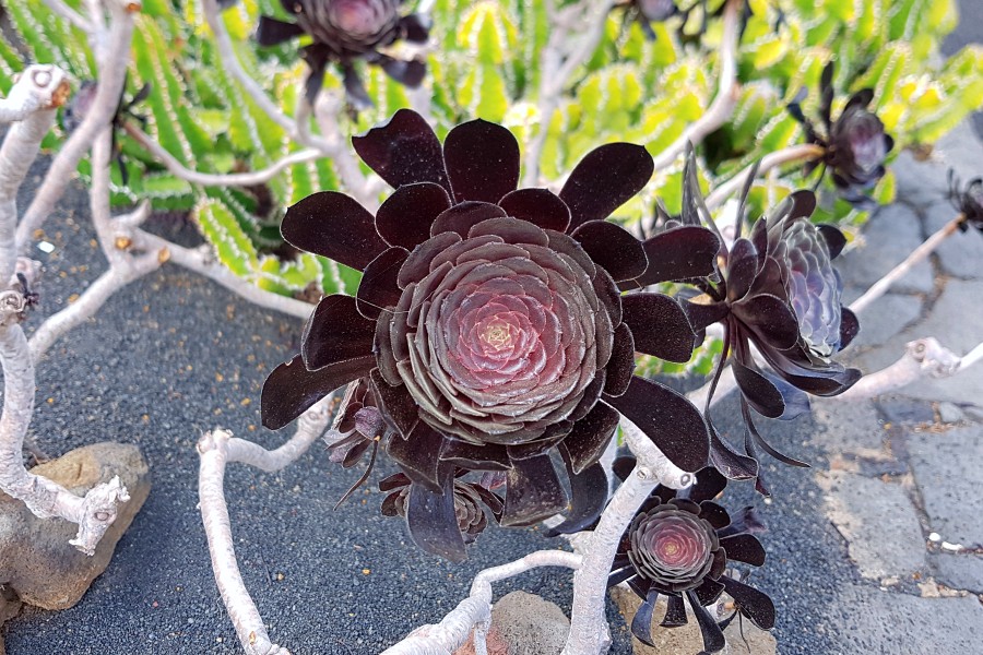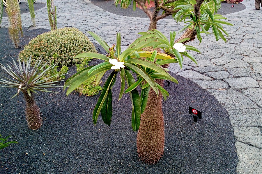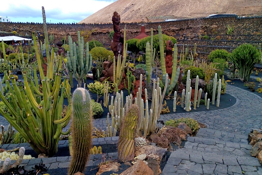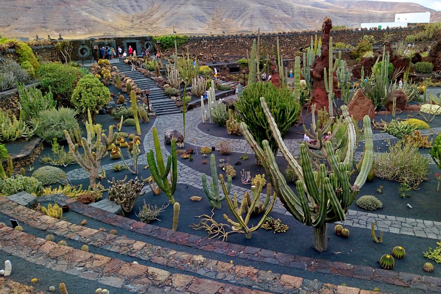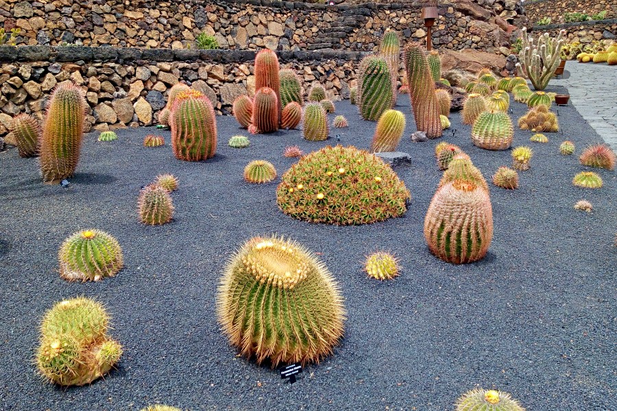 Um den Feigenkaktus in der Trockenheit Lanzarotes anzubauen, waren die heimischen Bauern erfinderisch: Die Setzlinge bekamen ein Bett aus Vulkanasche, in der sich die Feuchtigkeit aus dem Tau der Nacht sammeln konnte. Der Weinanbau in der Inselmitte nutzt das gleiche Prinzip. Gleich am Dorfrand von Guatiza wurde das benötigte Aschegranulat, das hier meterdick die Landschaft bedeckt, in großem Stil abgebaut und eine riesige Grube entstand. Diese Mulde mit den Dimensionen eines Steinbruchs gestaltete der Künstler César Manrique zu einem Kaktusgarten um. 1989 begannen die Arbeiten, bereits zwei Jahre später wurde Eröffnung gefeiert – und entstanden war ein botanisches Kleinod: Etwa 5.000 Quadratmeter groß, mit mehr als 10.000 Pflanzen von über 1.400 verschiedenen Kakteenarten aus der ganzen Welt.