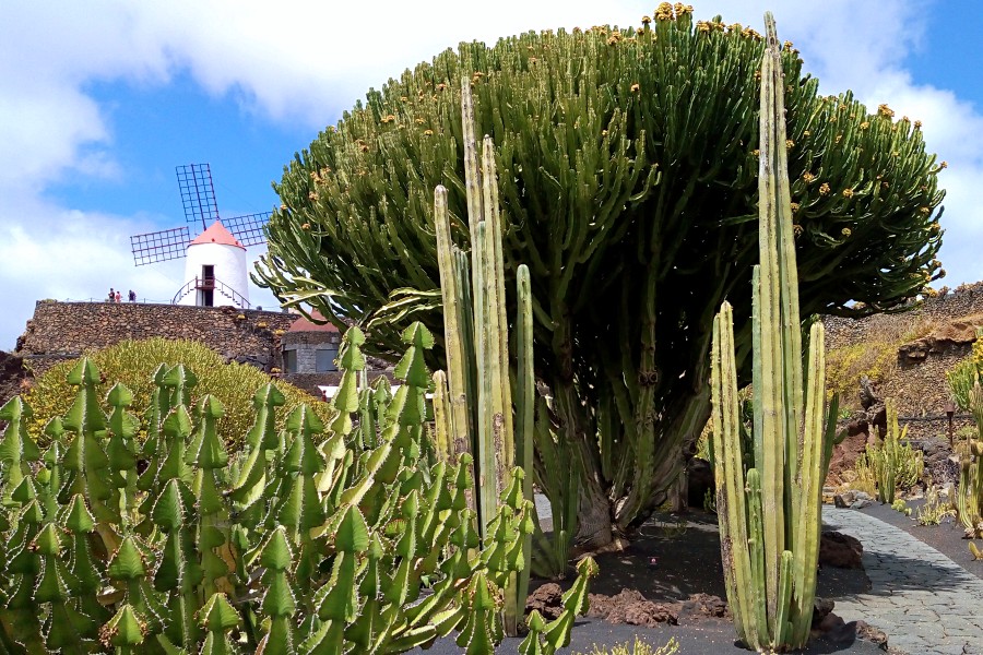 In Reiseführern steht, der Jardín de Cactus sei eine kunstvolle Kombination aus schwarzem Vulkangestein und grünen Kakteen, und César Manrique habe es einmal mehr geschafft, Kunst und Natur harmonisch miteinander zu vereinen. Das trifft uneingeschränkt zu, und wenn der Besucher idealerweise ein Faible für Gartenkunst und Botanik hat, betritt er einen Garten Eden. Der Schaugarten ist der Form eines Vulkankraters nachempfunden. Auch der Vergleich mit einem antiken Theaterrund würde passen. Die Wälle an den Seiten sind wie Zuschauerränge terrassenförmig angelegt. Sie sind in mehreren Ebenen bepflanzt und durch Wege gegliedert. Die Mitte des Rondells ist die zentrale Bühne, der eigentliche Garten, den man mit Fug und Recht auch als Park bezeichnen kann. Hier gibt es eine kleine Teichlandschaft, umgeben von prächtig bepflanzten Beeten mit Kakteen und Sukkulenten aller Arten und Größen. Das Rund komplettiert sich mit einem perfekt inszenierten Hintergrundbild: Auf einem Sockel aus aufgeschichteten Vulkanfelsen steht eine Mühle. Ihre weißgetünchten Mauern, das terrakottarote Dach und das graue Gitterraster der Windmühlenflügel heben sich strahlend gegen das Blau des Himmels ab.