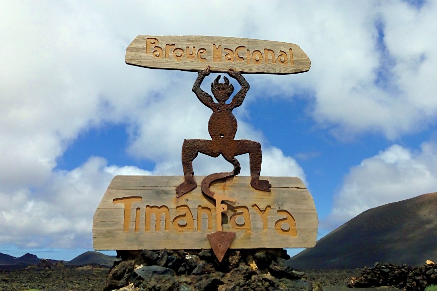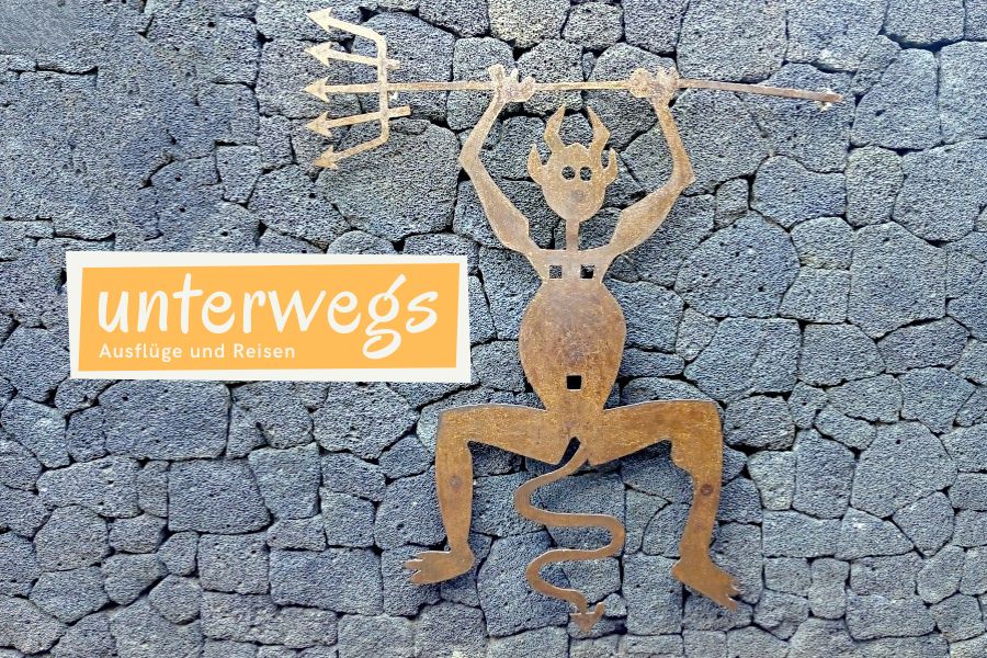 Timanfaya ist der Name eines der Dörfer, die unter den Lavawalzen begraben wurden. Wo einst Häuser und Felder waren, deckt seither eine meterdicke Schicht vulkanischer Ablagerungen die Landschaft zu. Mitten hindurch führt die Straße zum Besucherzentrum, sie ist von Weitem unsichtbar, denn die Fahrbahn wurde tief in die Schlacke gefräst. Das Fahrzeug vor uns wirkt wie ein irrlichternder Punkt in dieser uferlosen Einöde. Der Teufel ist das passende Symbol für so eine Gegend. So sieht es also aus, wenn el Diablo das Höllentor öffnet, den Boden bersten und die Erde brodeln lässt. Und alle wissen: Er ist nicht verschwunden, er schläft nur gerade. Hin und wieder macht er sich mit Grummeln und Rütteln bemerkbar, wenn er sich tief im Bauch der Erde auf die andere Seite dreht.