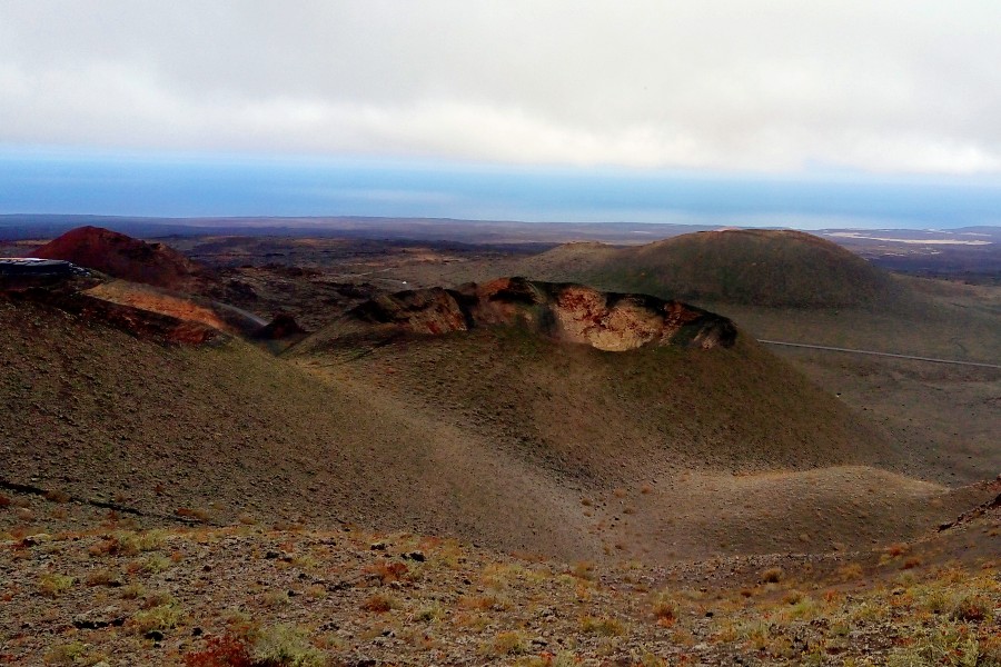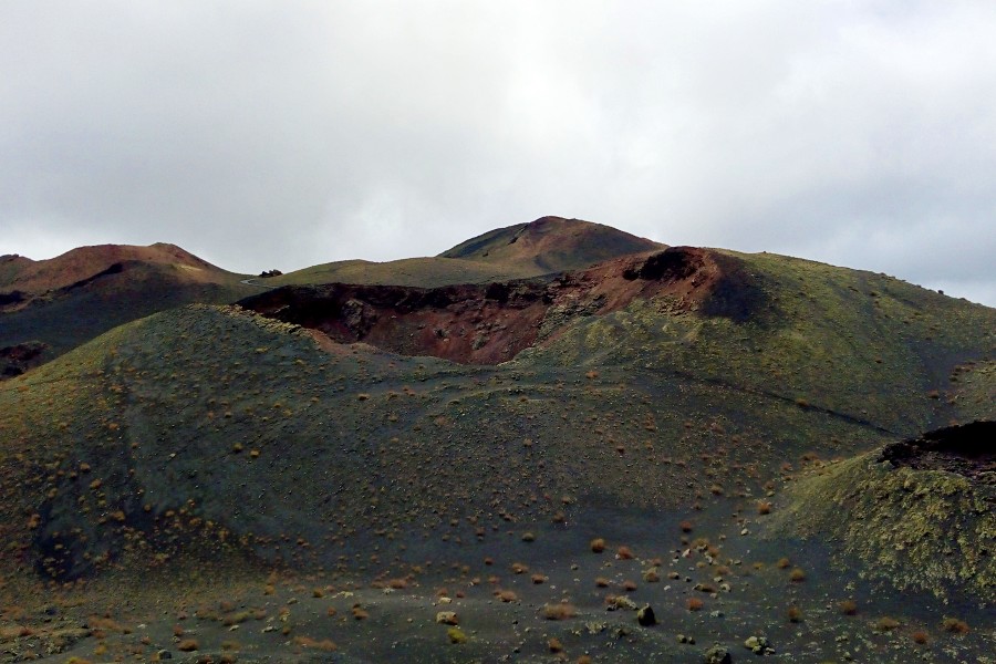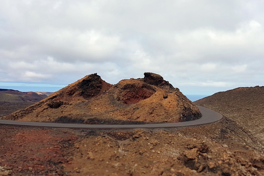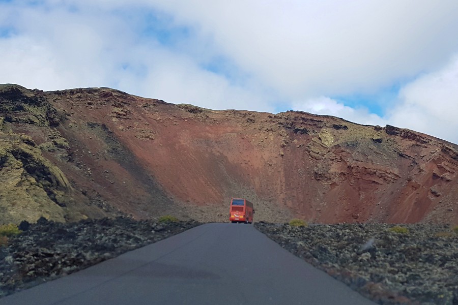 Die Teilnahme an der Bustour, so wird uns erklärt, ist die einzige Möglichkeit, die Kraterwelt des Nationalparks zu erkunden. Der verständliche Grund: Die Strecke ist lang, windet sich um die Vulkankegel, führt in luftige Höhen, passiert schmale Furten und nähert sich steilen Abgründen. Das ist nur etwas für wirklich versierte Fahrer. Vor der Abfahrt glauben wir es, danach würden wir es direkt auch unterschreiben. Die Rundfahrt wird in jeder Hinsicht atemberaubend. Unterwegs werden wir über die Buslautsprecher mit Anekdoten und Infos versorgt. Während vor dem Fenster die Vulkankrater langsam vorbeigleiten, hören wir zu: Drei Viertel der Insel Lanzarote sind von Lava bedeckt, rund 100 Vulkane haben über 300 Krater gebildet. Sechs Jahre dauerten die letzten Ausbrüche. Sie transportierten Abermillionen Kubikmeter Eruptivmaterial aus dem Inneren der Erde. Noch heute beträgt hier die Bodentemperatur nur wenige Meter unter der Oberfläche mehrere hundert Grad. Die sachlich aufgeführten Daten und Fakten im Ohr und die fremdartigen Farben und Formen vor Augen, verbreitet sich eine verstörende Atmosphäre. Mystische Musik verstärkt den Eindruck, durch eine surreale Welt zu schweben, eine Mondlandschaft oder eine Fantasiewelt, die durch einen dunklen Zauber versteinert wurde. Unsere Blicke wandern über ein Meer aus Lavawellen die aschebraunen Vulkanhänge hinauf und dann wieder hinab in die Kraterrachen.